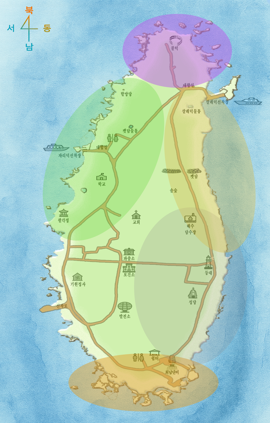 | 남쪽 갯바위 일대 | 오리류, 갈매기류, 백로류, 할미새류, 멧새류, 개개비류, 뻐꾸기류, 맹급류, 솔딱새류 등 | 밤색뻐꾸기, 쇠물닭, 꼬가참새, 후투티 ... |